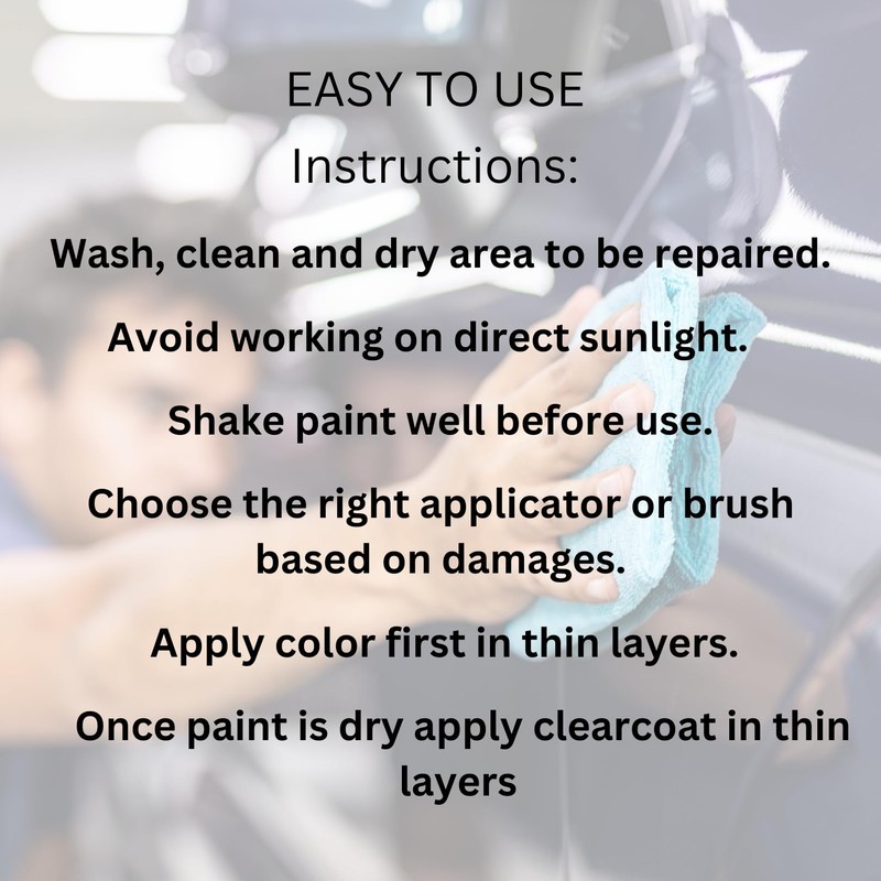 Premium paint comes in a 15ml (0.5 fl. Oz.) bottle. Our professional touch up kit includes paint, clearcoat, and the tools necessary to get great results. We guarantee our premium custom-mixed touch up paint, JUST TOUCH IT UP uses high-quality materials to achieve durable and long-lasting repairs, our paints are not diluted like other brands, giving you excellent coverage and great results. Our colors are rich in pigmentation so you can achieve a durable high gloss repair that will last for years to come. You can use rubbing alcohol, lacquer thinner or acetone to clean your applicators and brushes to reuse them in the future. Always remember to use safety eyewear and gloves.