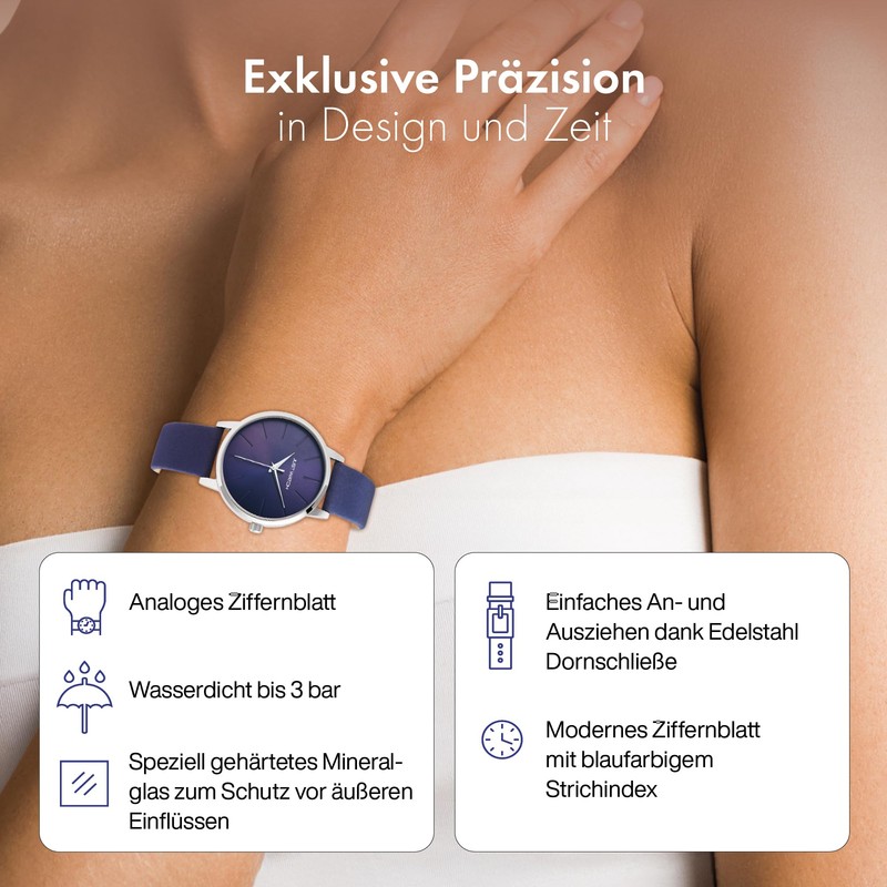 - Blue genuine leather strap with stainless steel pin buckle