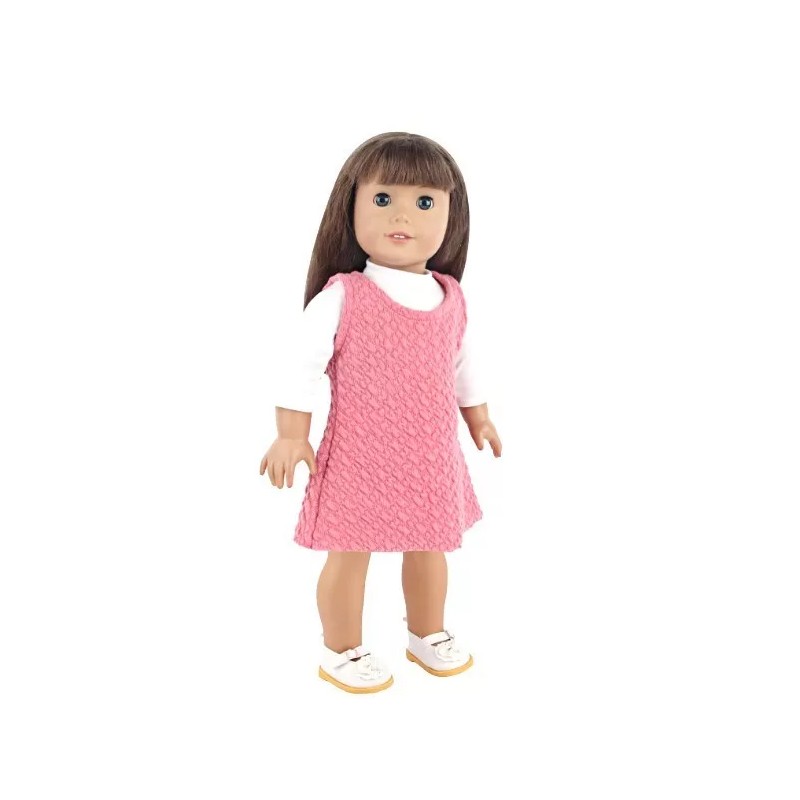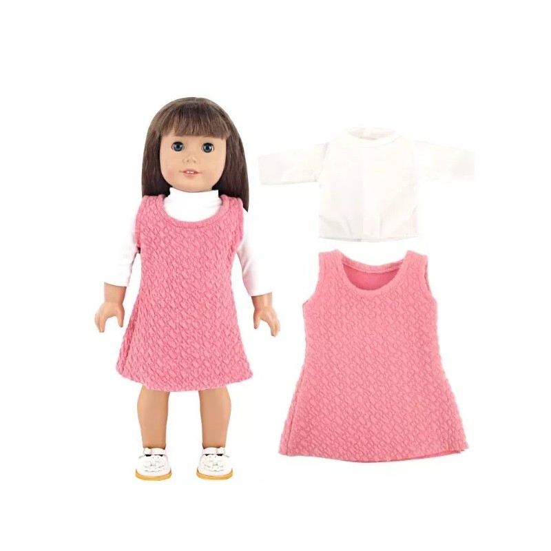 ♥ Get your American Girl Dolls ready for any occasion with this trendy rose-pink color jumper and white long sleeve turtleneck top set. Made from a soft cotton poly blend material, this everyday and casual activewear is perfect for fall and winter seasons. The set includes two pieces and is compatible with 18-inch soft body dolls by Major Manufactures. With its unique design and stylish color combination, this JustAskJoyce Collection activewear is a must-have for any doll enthusiast. Whether you are looking to add to your collection or want to give your dolls a fashionable makeover, this product line is perfect for you. Don't miss out on this opportunity to make your American Girl Dolls stand out from the crowd! Check out our great shoe selection for this outfit.