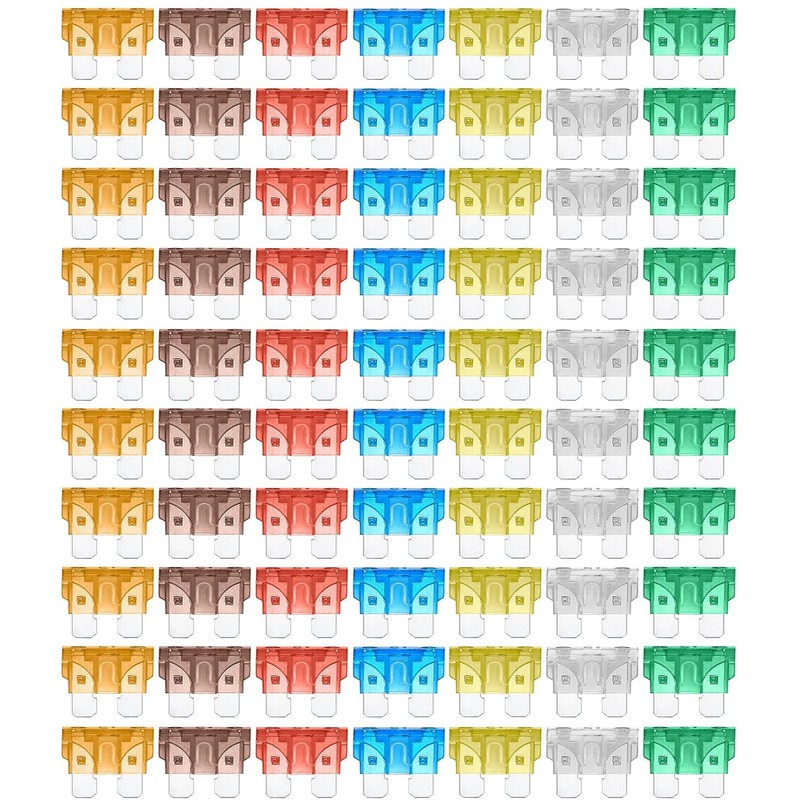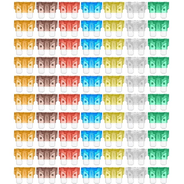 • Set Contents: 10 each of 5A/7.5A/10A/15A/20A/25A/30A types, 70 pieces together. Fuse removal tool x 1, storage box x 1. Meet your different needs