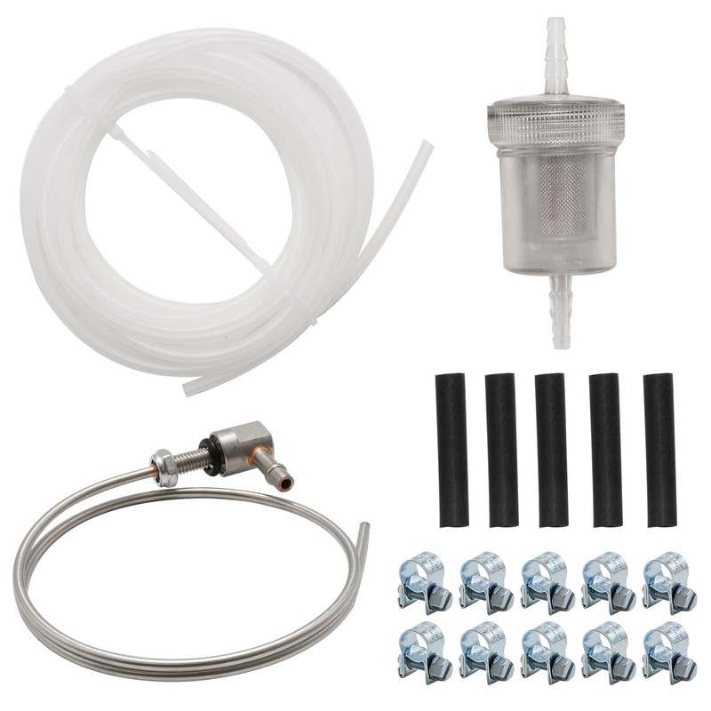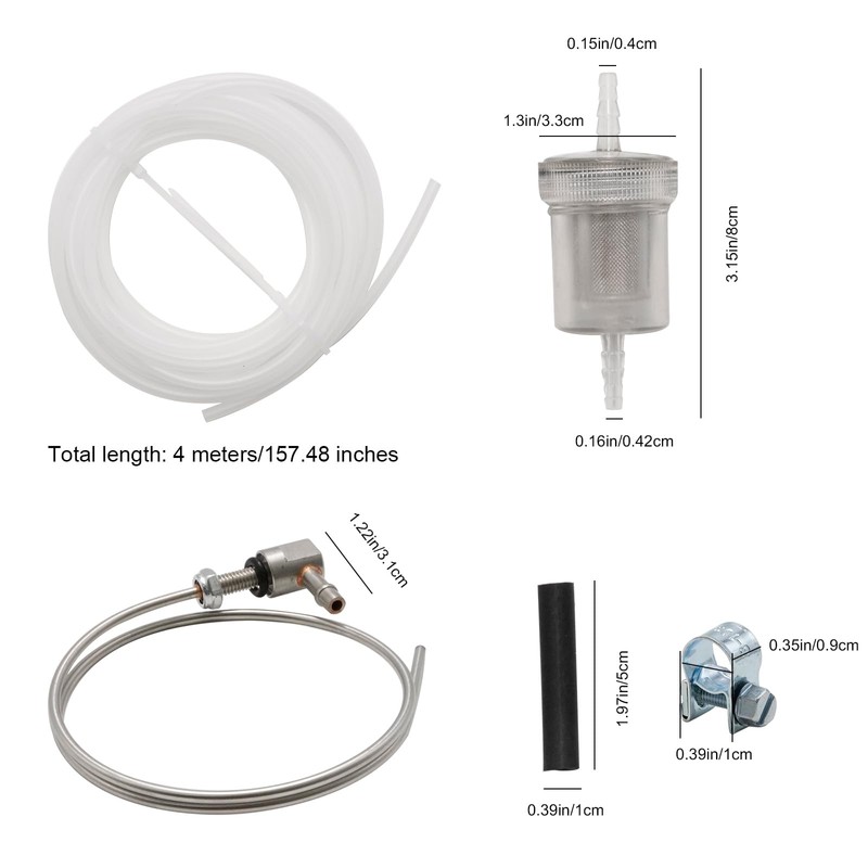 - Package Includes: 1 x fuel tank stand pipe 1 x Fuel filter 1 x 4M long fuel line 5 x rubber pipe and 10 x hose clips