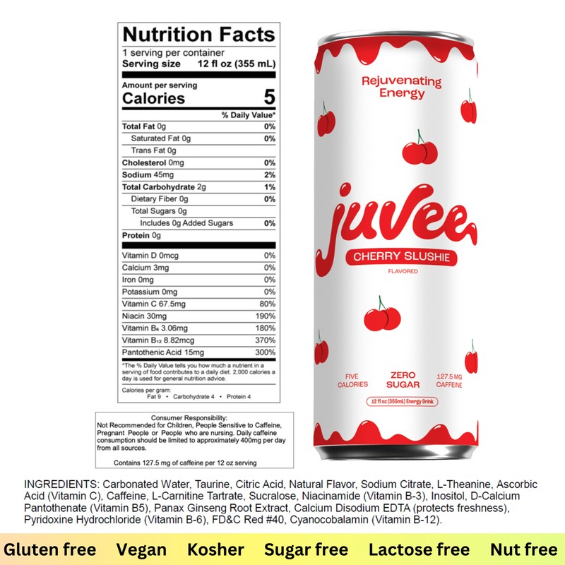 - Immunity Support For Well Being: Every sip of Cherry Slushie is packed with Vitamin C to give you the immunity boost you need to feel healthy and energized. For daily immune support, Juvee delivers 80% of the daily recommended value of Vitamin C. Whether you're a gamer, creator or just working through the day, Juvee helps you stay feel great while you connect, create, and play!