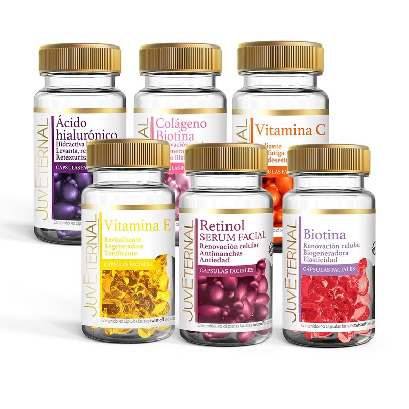 Juveternal Kit 6 frascos Cápsulas Faciales Ácido Hialurónico Cápsulas Faciales Colágeno Biotina Cápsulas Faciales Vitamina C Cápsulas Faciales Vitamina E Cápsulas Faciales Biotina Cápsulas Faciales Retinol 90 cáps c/u Efecto Litting Reafirma y Retexturiz