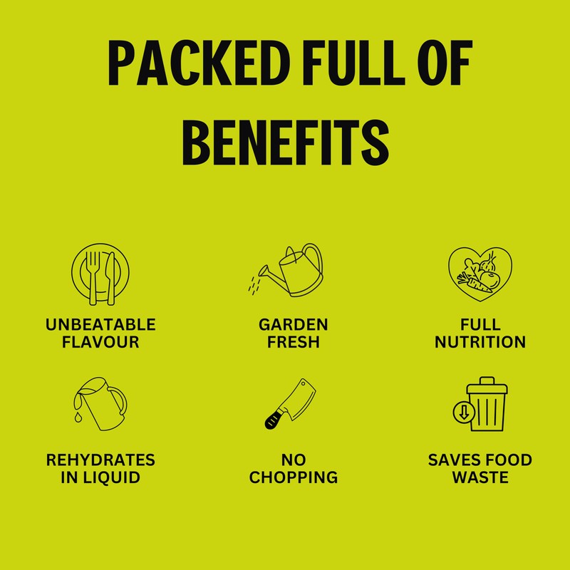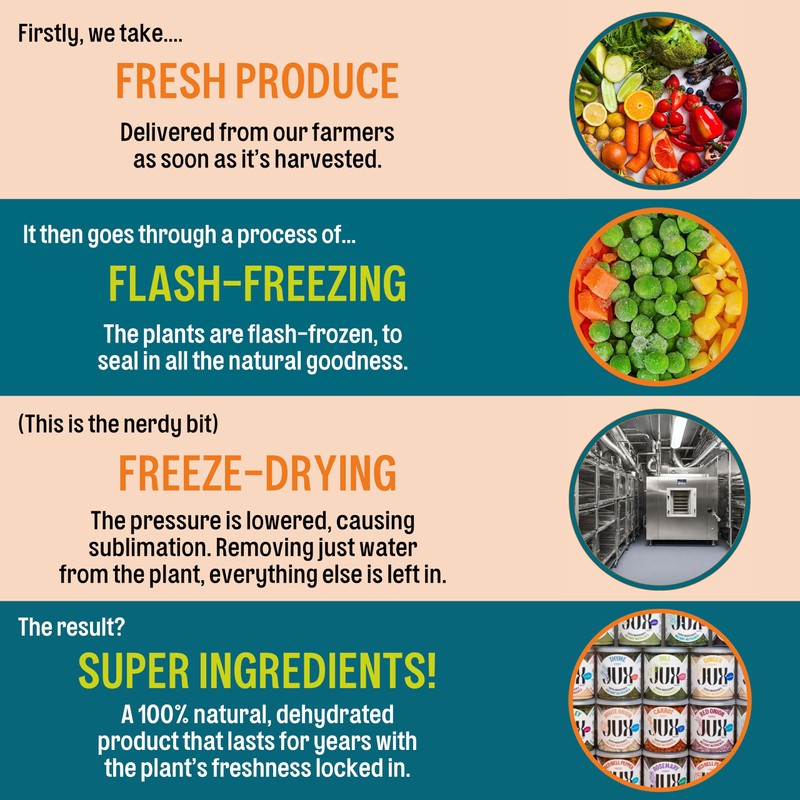 - FREEZE DRIED: Freeze-drying is a dehydration process that removes just the water from fresh ingredients. We do this by freezing the product so all the goodness is locked in, and then lowering the pressure slowly, preserving the nutrients, flavour, and texture. We don't need to add any nasty preservatives into our products, our entire range is 100% natural and additive free. Just the way nature intended!
