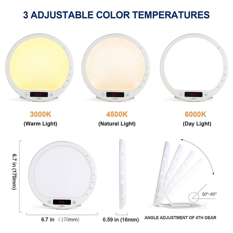 - 【3 sets of sunlight color options】Warm (like morning sun, color temperature 3000K), Cold (like noon sun, color temperature 6000K), Mixed color (color temperature 4500K). cold color temperature is suitable for wake up (sunrise mode), and it’s more effective for adjustment of bio-clock and concentration; warm color temperature is suitable for reading and sleep assisting (sunset mode).