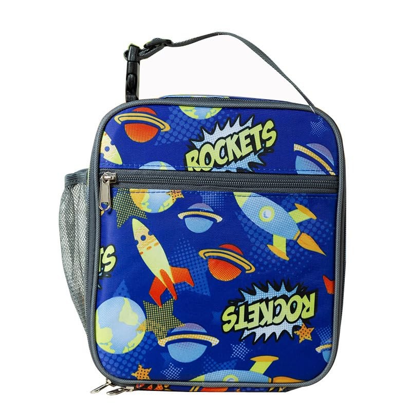JYhoney Kids Lunch Box Insulated Soft Bag Mini Cooler Back to School Thermal Meal Tote Kit for Girls, Boys, Outer Space Rocket Ships in Dark Navy Blue