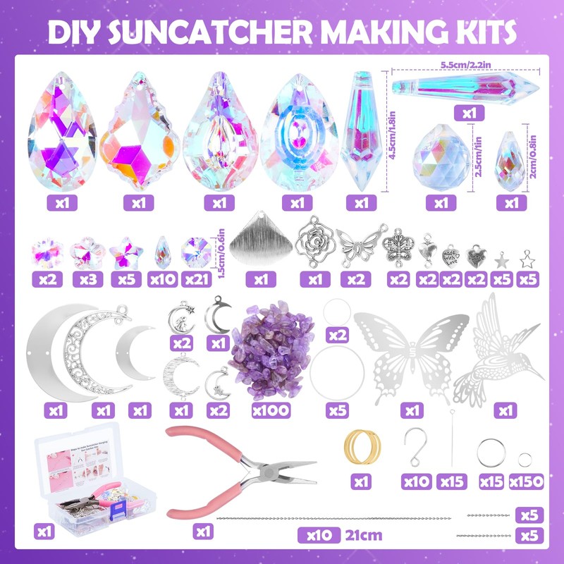- DIY suncatcher kit contains: 400 accessories with a selection of crystal beads, crystal pendants, purple crystals, metal hummingbird roses, a selection of moon, star and heart metal decorations and tools