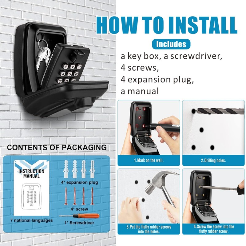 • 【Easy to Install】:The combination key lock box comes with all necessary installation components, including four screws and four nylon expansion bolts, along with a dual-head screwdriver for convenience. Only 4 simple steps to finish the installation: 1.Drawing screw outline 2.Drilling holes 3.Nail into expanded plugs 4.Install the box by screws.