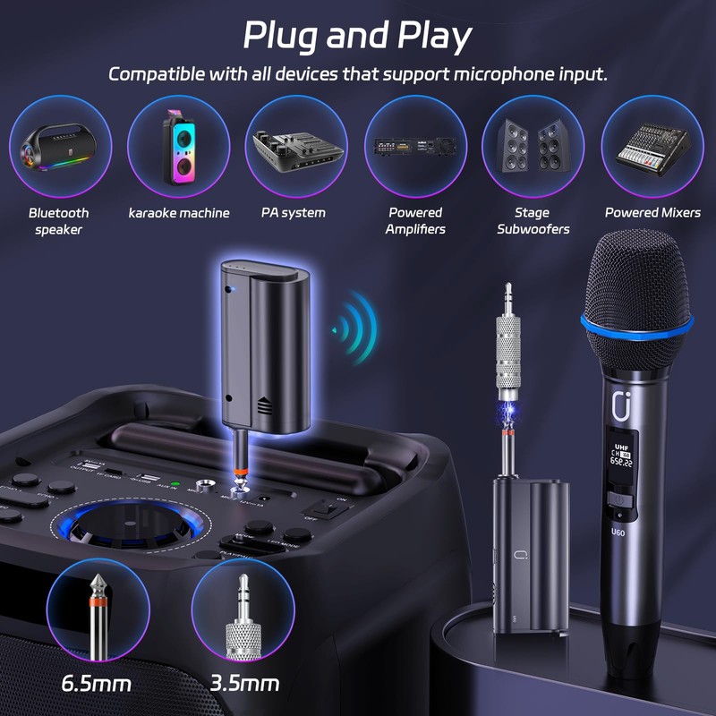 - 【Fácil de Usar: Plug and Play】Súper sencillo de configurar. Enciende el micrófono y el receptor JYX, conecta el receptor en la entrada de micrófono de 6.35 mm o 3.5 mm de tu altavoz, ¡y listo! Compatible con sistemas de sonido, máquinas de karaoke, amplificadores, mezcladoras, altavoces Bluetooth y más, siempre que admitan entrada de micrófono.