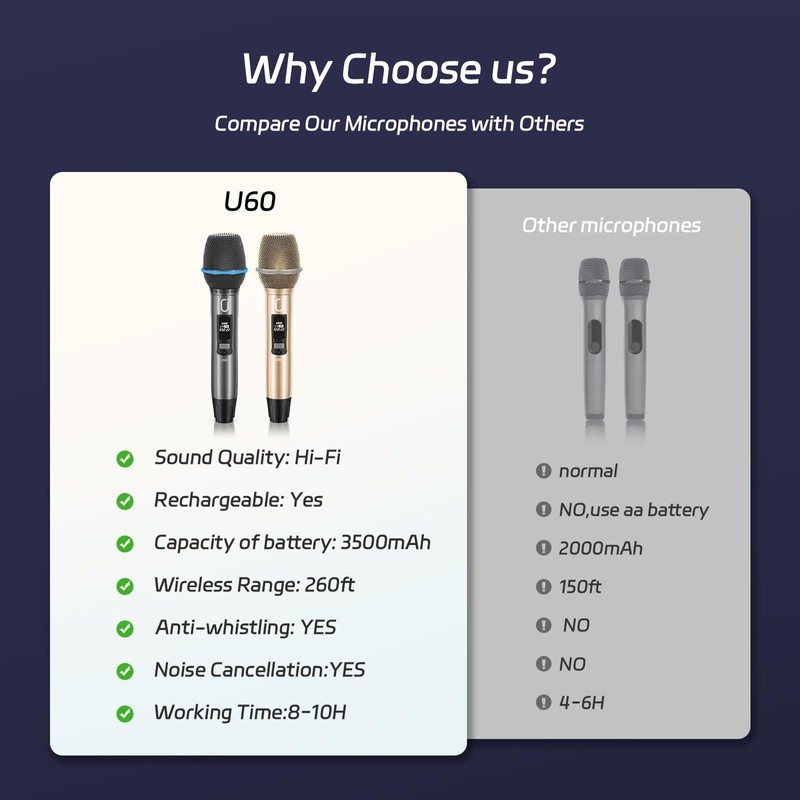 - 【Reproducción de Sonido Superior】Equipados con chips DSP avanzados y tecnología UHF (Ultra Alta Frecuencia), los micrófonos inalámbricos JYX garantizan una transmisión de señal estable con excelente calidad de sonido, mínimo ruido y distorsión. Los chips DSP reducen ruido y eco, logrando un sonido más claro y natural, mientras que la tecnología UHF ofrece una fuerte capacidad antiinterferencias. Perfecto para presentaciones en solitario, discursos, conferencias, reuniones, enseñanza y karaoke.