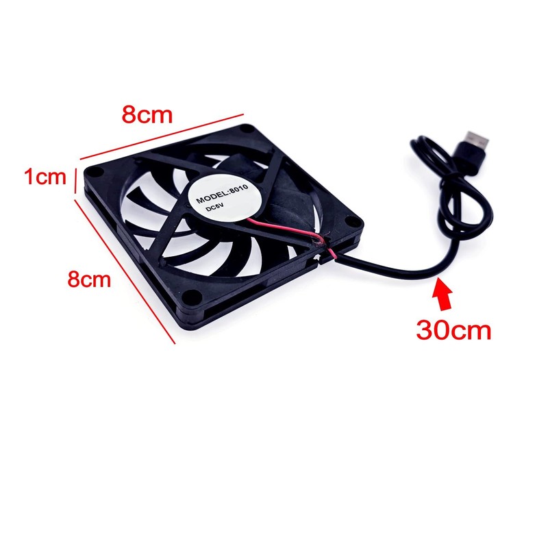 - Size: about 80mm x 80mm x 10mm (length x width x thickness). Voltage: DC 5V. Current: 0.3A. Power: 1.5W. Speed: 2500 rpm. Air volume: 18.65CFM. Noise: 31.3 dBA. Operating Temperature: -30 ~ +70 ℃ . Sleeve bearing. Material: plastic frame and blades.