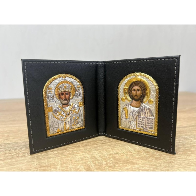 (K-03-01) Jesus Christ - Saint Nicholas/Byzantine Silver Orthodox Pocket Icon/Greek/Handmade (black, 3x3)