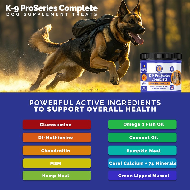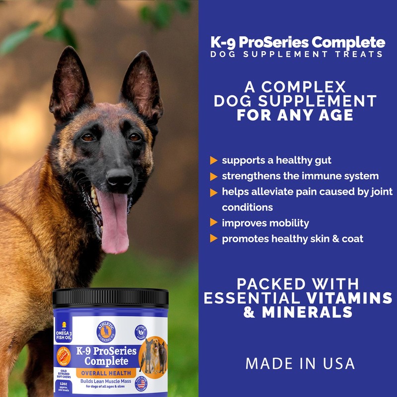 Unleash the power of probiotics for your furry friend with K-9 ProSeries Complete Dog Supplement Treats. This comprehensive formula is packed with essential vitamins and minerals to support your canine companion at any age. Crafted with care in the USA, these treats promote a healthy gut, strengthen the immune system, alleviate joint pain, improve mobility, and nourish a radiant skin and coat. These tasty morsels are packed with 6 dog-specific probiotic strains that work wonders for your pup's overall health. Promote a healthy gut and reduce gastrointestinal issues while supporting their immune system and reducing allergic reactions. These treats enhance nutrient absorption and help eliminate toxins from the body. Not only do they support skin and coat health, but they also aid in managing anxiety and stress-related behaviors. Great for addressing allergies, bad breath, skin and coat issues, diarrhea, immune disorders, intestinal inflammation, irritable bowel syndrome, liver disease, obesity, skin disorders, and urinary tract infections. With powerful active ingredients, these treats are a game-changer for your canine companion's well-being.