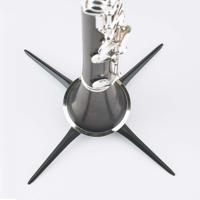 - Detachable metal leg base screws into the peg so that the entire unit can be stored in the bell of the instrument