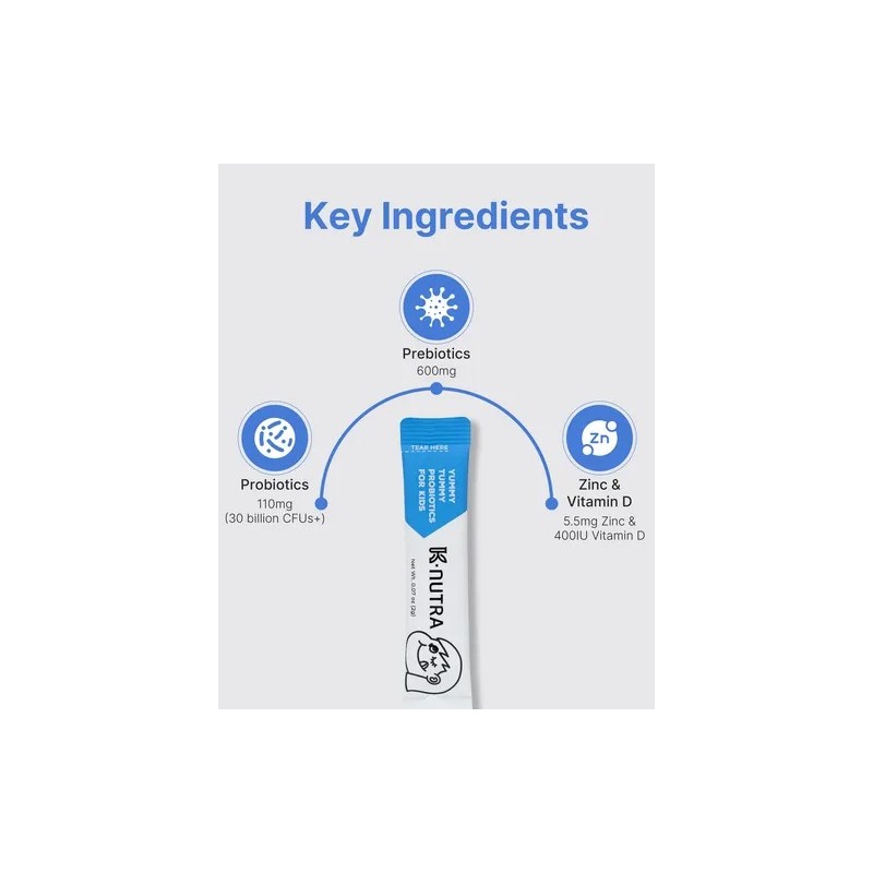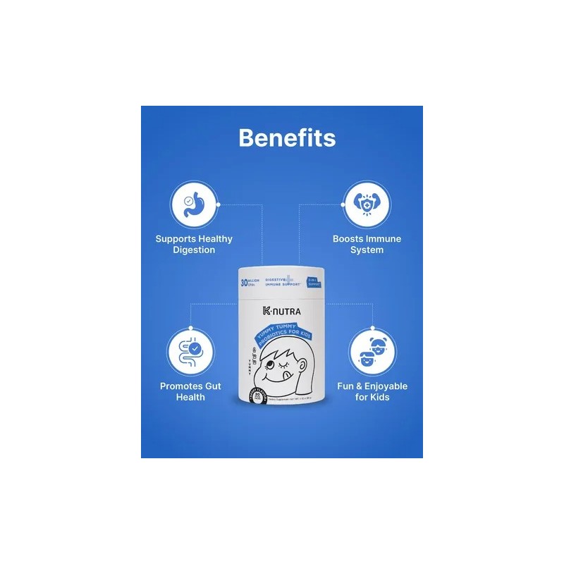 - K-NUTRA YUMMY TUMMY PROBIÓTICOS PARA NIÑOS (60g, 30 sobres) - Suplemento dietético premium con 30 mil millones CFU de 8 cepas probióticas diversas, incluyendo Lactobacillus y Bifidobacterium, diseñado para mejorar la digestión y salud intestinal de tu hijo con cada sobre conveniente.