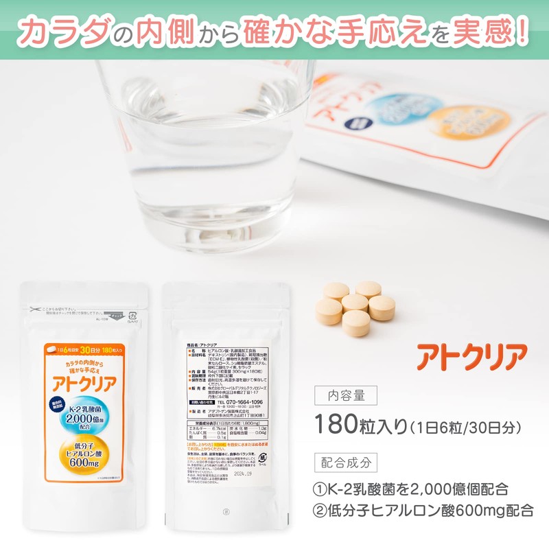 K2乳酸菌 2000億個 ECM・E 低分子ヒアルロン酸 600mg コラーゲン おなか 肌ケア サプリメント アトクリア タブレット 30日分 180粒