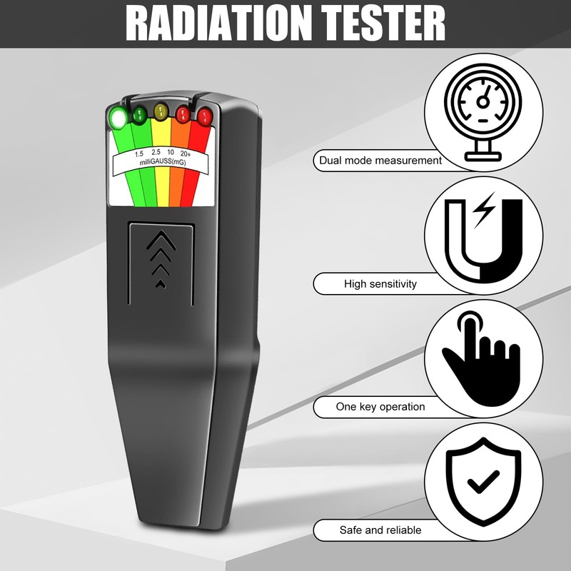 • ★Radiation values: First dark green light: range from 0 to 1.5 mg, normal, second green light: detection of low emf values, which range from 1.5 to 2.5 mg, low risk, third yellow light: detection to medium emf values between 2.5 and 10 mg, medium risk. iko, Fourred orange Colour light: detection of strong electromagnetic fields in the range of 10 to 20 mg, high risk, fifth red light: 20 + mg detected, very high emf range, very high risk