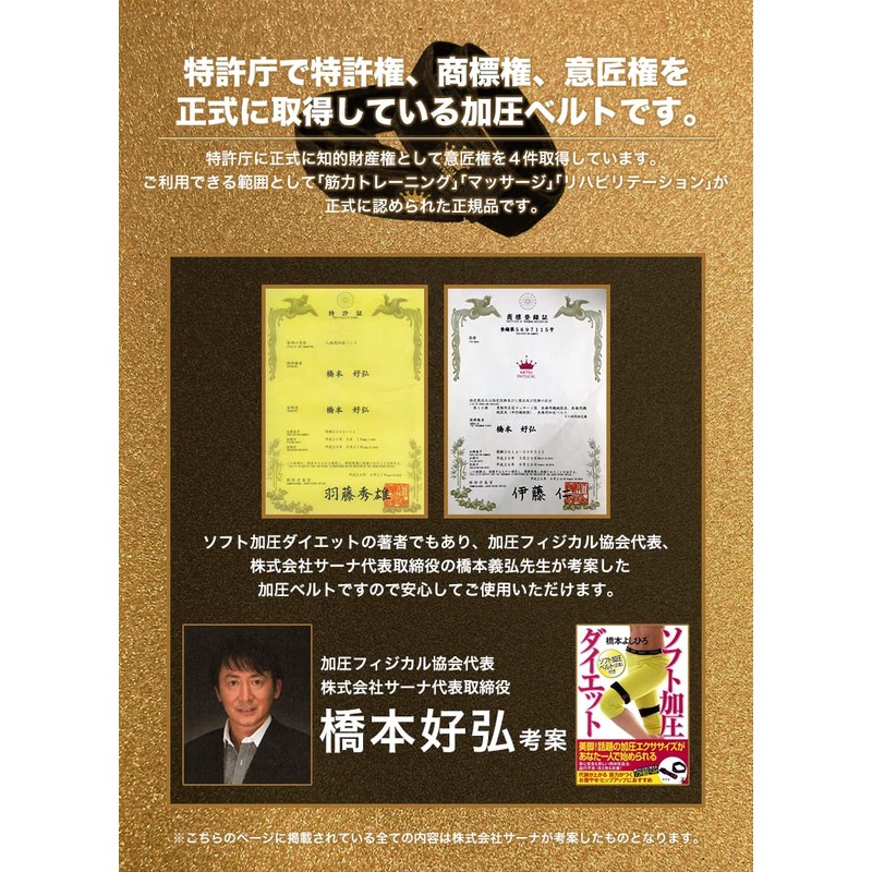 - 【特許権、商標権、意匠権を正式に取得】 特許庁に正式に知的財産権として意匠権を4件取得しています。ご利用できる範囲として「筋力トレーニング」「マッサージ」「リハビリテーション」が正式に認められた正規品です。
