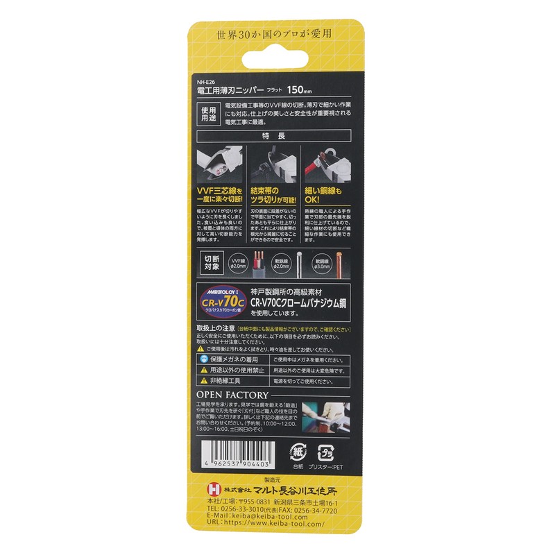 Kaba NH-E26 Flat Thin Blade Nipper for Electricians 5.9 inches (150 mm)