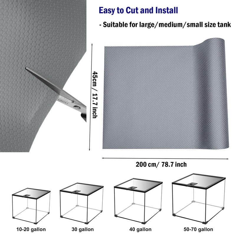 - EASY TO CUT AND USE : Two sizes available: 17.7x39.4inch, 17.7x78.7inch. this reptile carpet is suitable for a variety of common reptile tanks and enclosures. Such as reptile tank 20 gallon, 30 gallon, 40 gallon, 50 gallon, 60 gallon and smaller. It can be cut to fit any size or shape of a reptile habitat