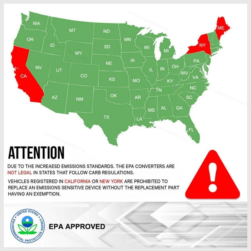 EPA-compliant catalytic converters are for use on EPA or Federal emissions certified-vehicles. EPA-compliant catalytic converters cannot be sold or installed in California and Colorado and in certain circumstances in Maine and New York. In those states, you must install a CARB-compliant catalytic converter on CARB emissions certified vehicles in the states of California and Colorado, on all vehicles. CARB-compliant converters contain more catalyst material in order to converter emissions more efficiently and comply with stricter emissions reduction requirements. Check the vehicle’s emissions control information label and consult your state’s aftermarket converter regulations to select the right catalytic converter.