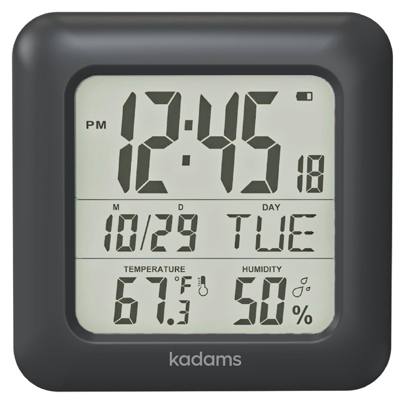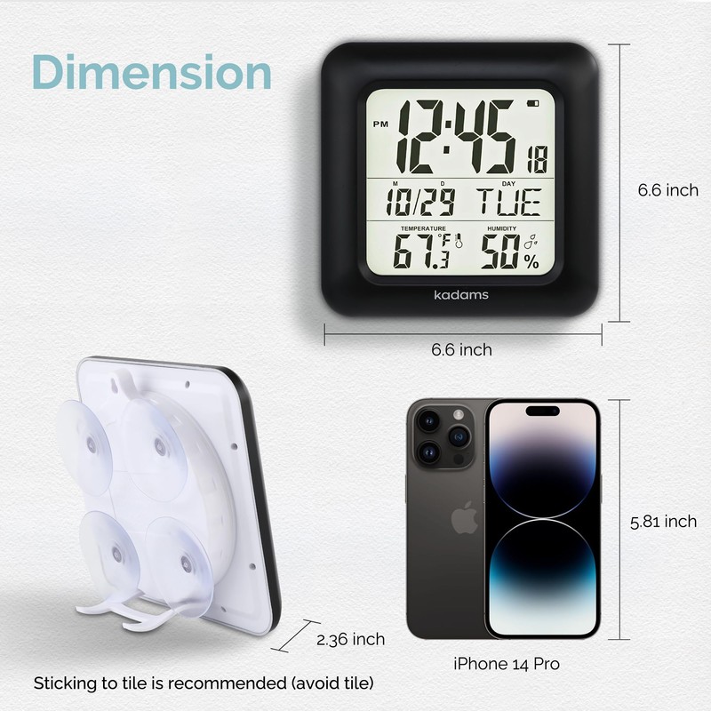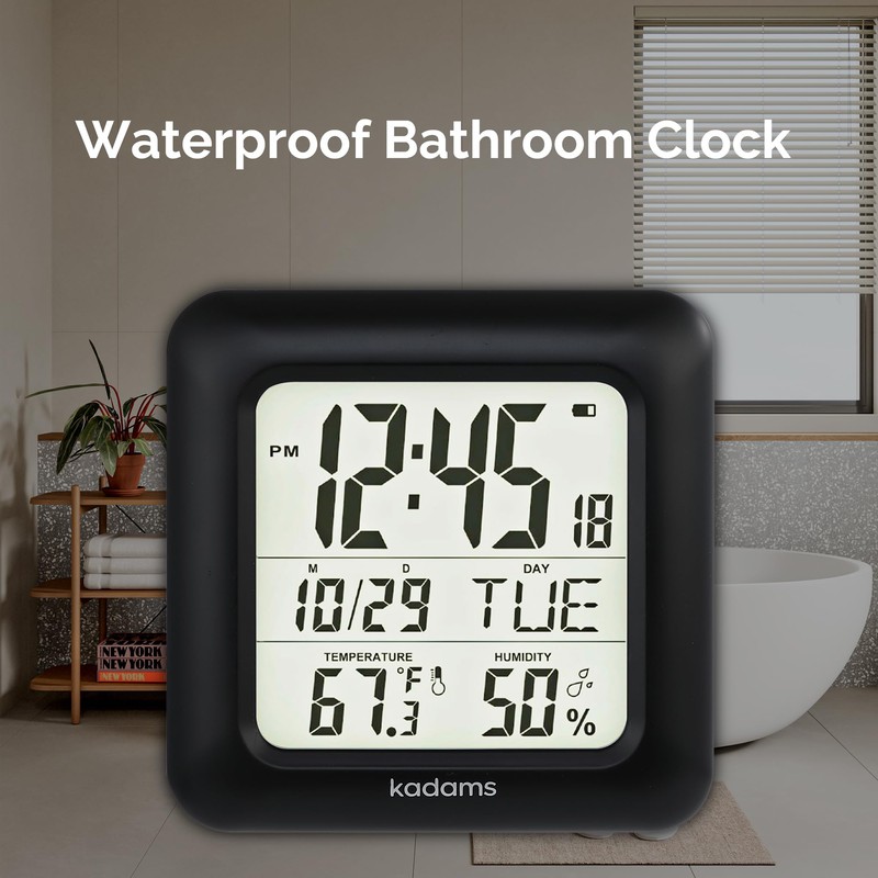 KADAMS Bathroom Clock 9.5" Kitchen Wall Clock with Large LCD Screen – Shower Clock with Suction Cup,Temperature, Humidity, Calendar – Water-Resistant, 4 Mounting Options, Black