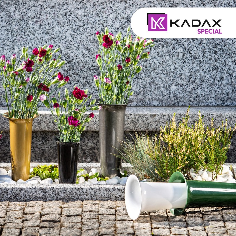 - Are you looking for an impressive decoration for the graves of your loved ones? You've come to the right place. We introduce our flower vase from the Kadax brand, which not only accentuates the plant beautifully, but is also a real decorative piece itself. It matches well with different flower colours, stabilises and protects the bouquet from adverse weather.