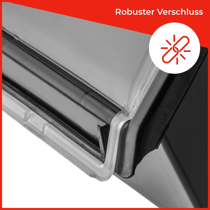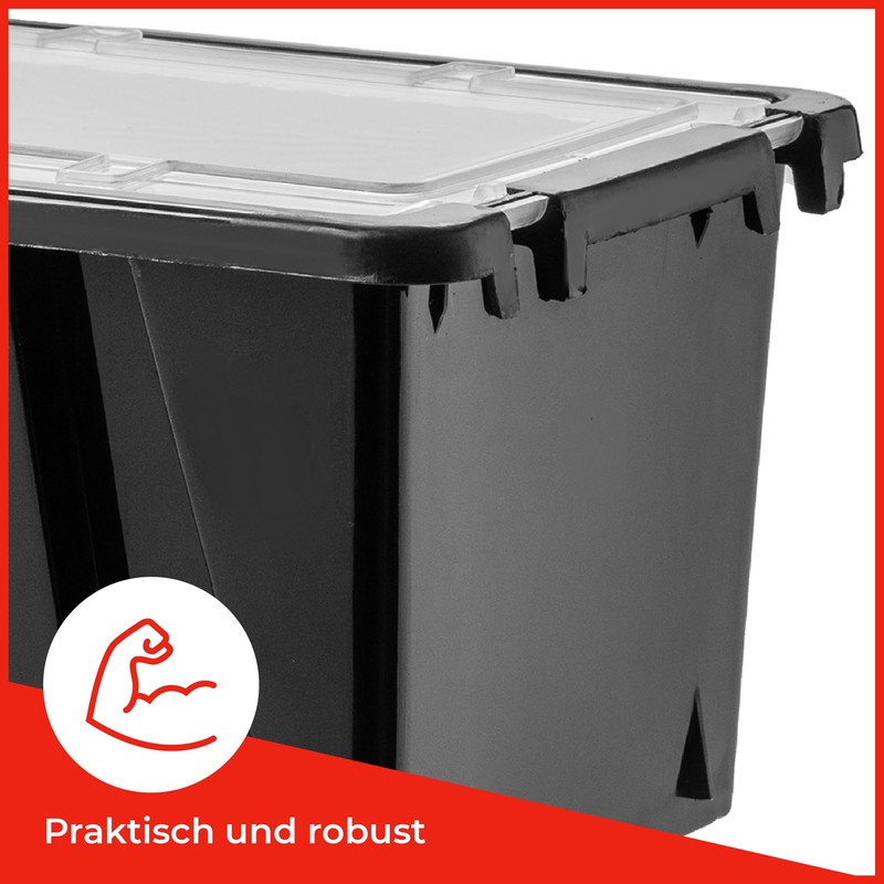 - Robust: the stacking box is made of a particularly robust plastic (PP). It is equipped with a clear lid that protects the contents from dust, dirt and spills during transport.