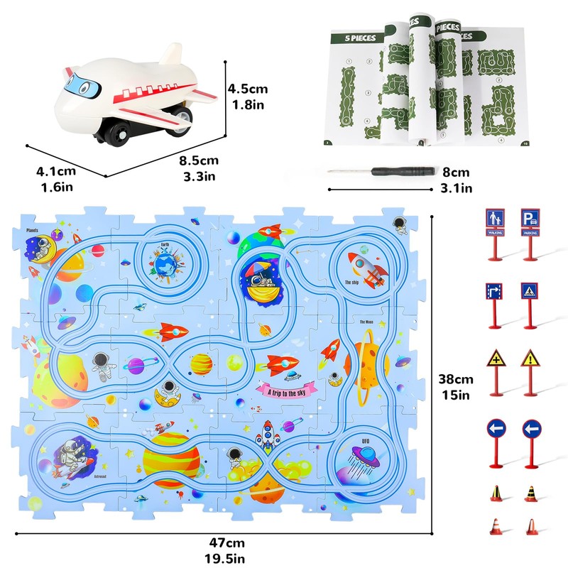 - Toy car racing track play set for children with hours of fun and intelligence development: the children plan and place puzzle pieces with different track paths and place the battery-operated aircraft vehicle on the puzzle track to drive and loop.