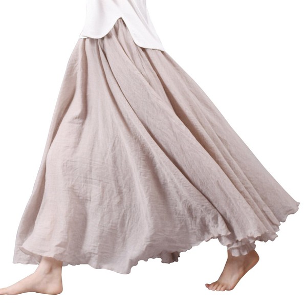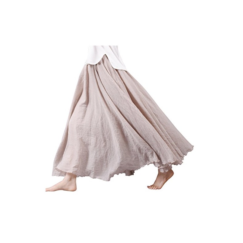 Kafeimali Women Bohemian Cotton Linen Double Layer Elastic Waist Long Maxi Skirt (Beige, 85CM-Length)