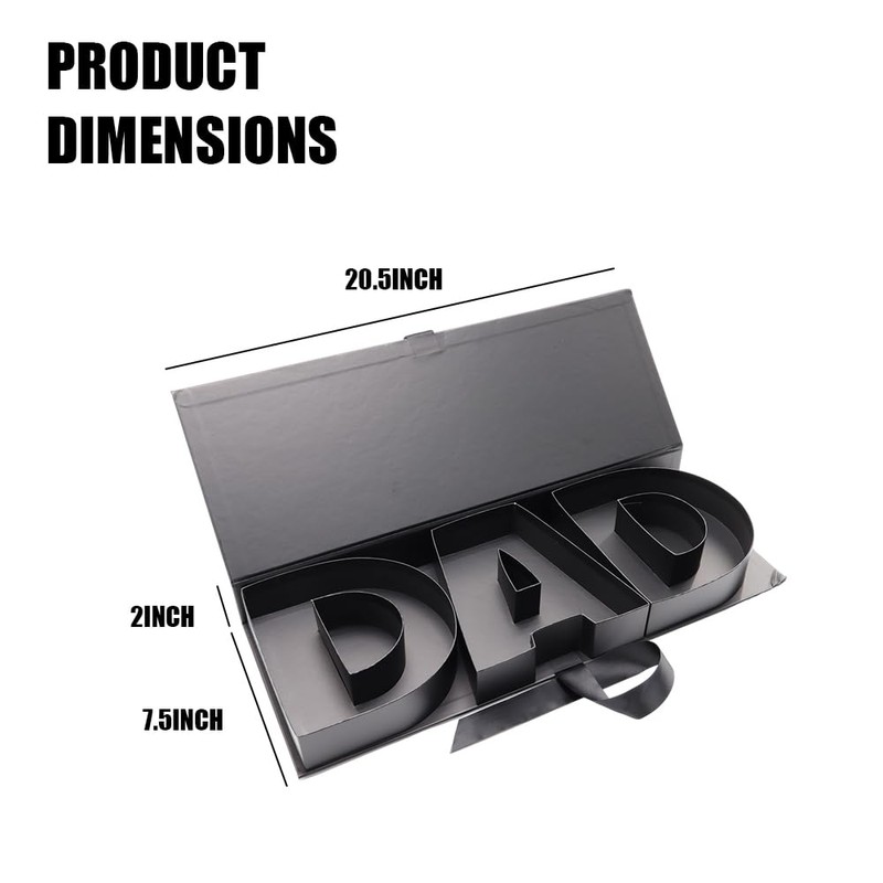 - DESIGN: Unique DAD-shaped cardboard container with stylish letter cutouts that create an eye-catching presentation