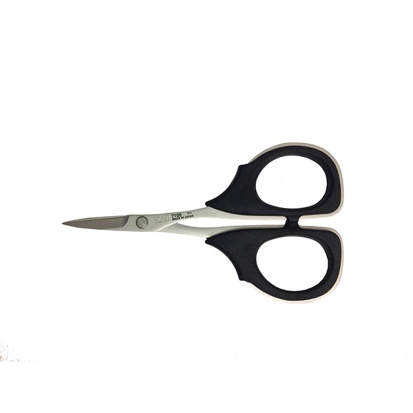 This is the Kai 7100, 4 in. Professional Scissor. It is ideal for tasks that require a small but powerful cutting tool. The blade is made of a high-carbon stainless steel that ensures a sharp cut, all-the-way to the tip. It also features large handles made of "Elastomer" soft plastic, which are designed for better leverage and ease of handling while cutting.