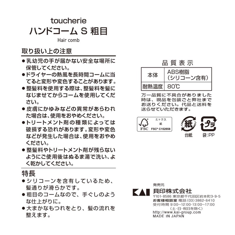 Kai Corporation Hand Comb, S, Coarse Comb, Treatment Comb, Travel, Toucherie, 1 Piece (x 1)