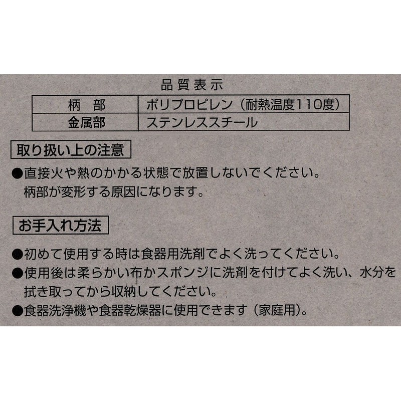 - Material: Metal parts: Stainless steel; Handle: Polypropylene (heat-resistant temperature: 232°F (110°C)