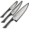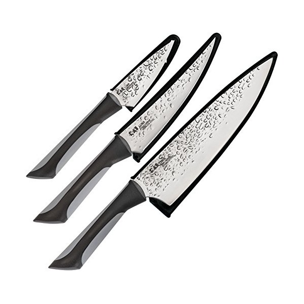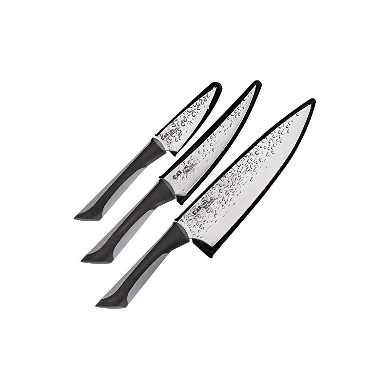 - Includes chef's, utility, and paring knife with matching sheaths