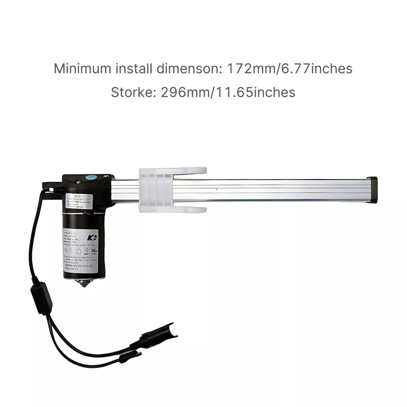- The storke is 296mm/11.65inches, Minimum install dimenson is 172mm/6.77inches