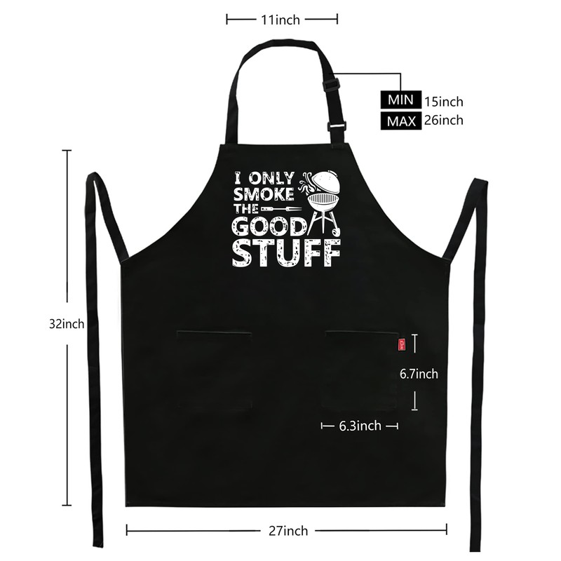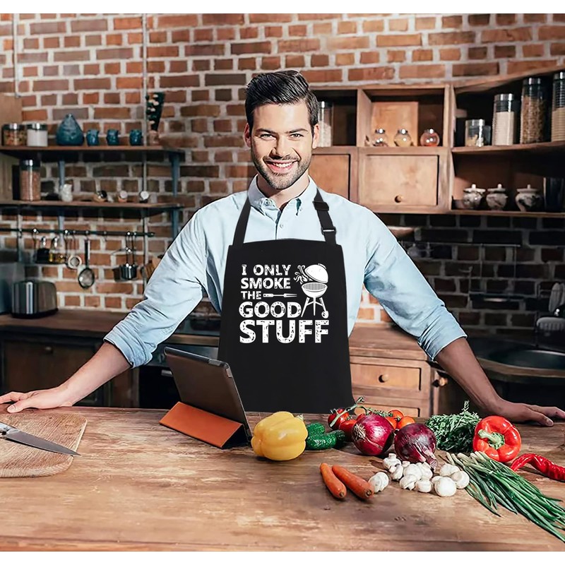 - 🎁 Funny Apron Gifts: With hilarious saying "I Only Smoke the Good Stuff", our men’s funny aprons are great cooking gifts for dad, husband. They also make the perfect grilling gifts for father’s day, birthday, Christmas. So why settle for a boring & generic gift when you can give the gift of laughter with our humor apron? Show your loved ones that you care by giving them a memorable gift. Order now and experience the joy and laughter that our funny cooking aprons for men bring to any occasion