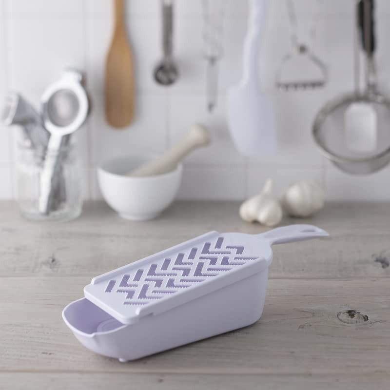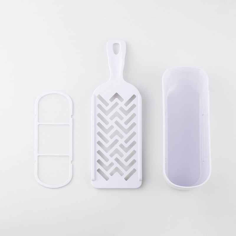 - This grater is full of ingenuity to make it a delicious grater without putting effort into it. The long grater surface makes it easy to grate large ingredients such as radish. We added twist to the alignment of the blade and the height of the eye. Blade angle is 45 degrees diagonally. Each eye has been changed in height and pitch for less resistance and even gration. The 7-degree angle plate makes it easy to apply pressure to food. Includes a perforated tray to remove excess water for grating radish