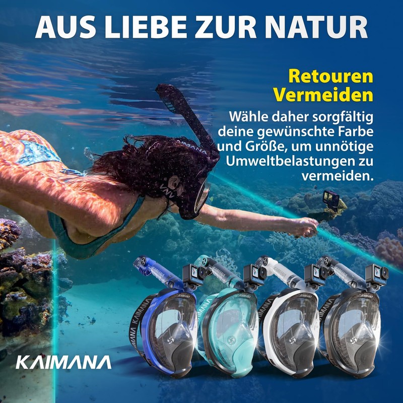 - Advanced return for KAIMANA snorkel equipment for a whole 100 days! Not satisfied? Wende Dich an unseren Kundenservice und Du bekommst von uns eine Lösung nach deinen Wünschen, großes KAIMANA Ehrenwort!