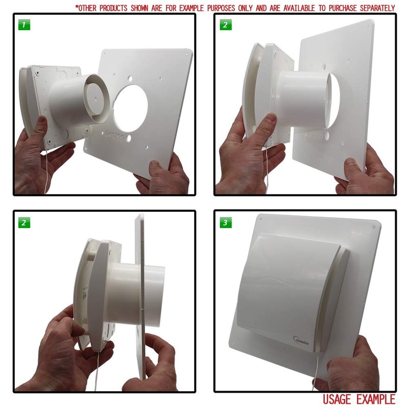 Designed to create a professional and neat finish to the installation of a Kair Smart fan, the Kair Smart Fan Wall Plate allows you to easily cover up any small damages created when using a core drill to drill to the outside of a building. This saves time and money on trying to find and replace identical tiles in a bathroom or kitchen.