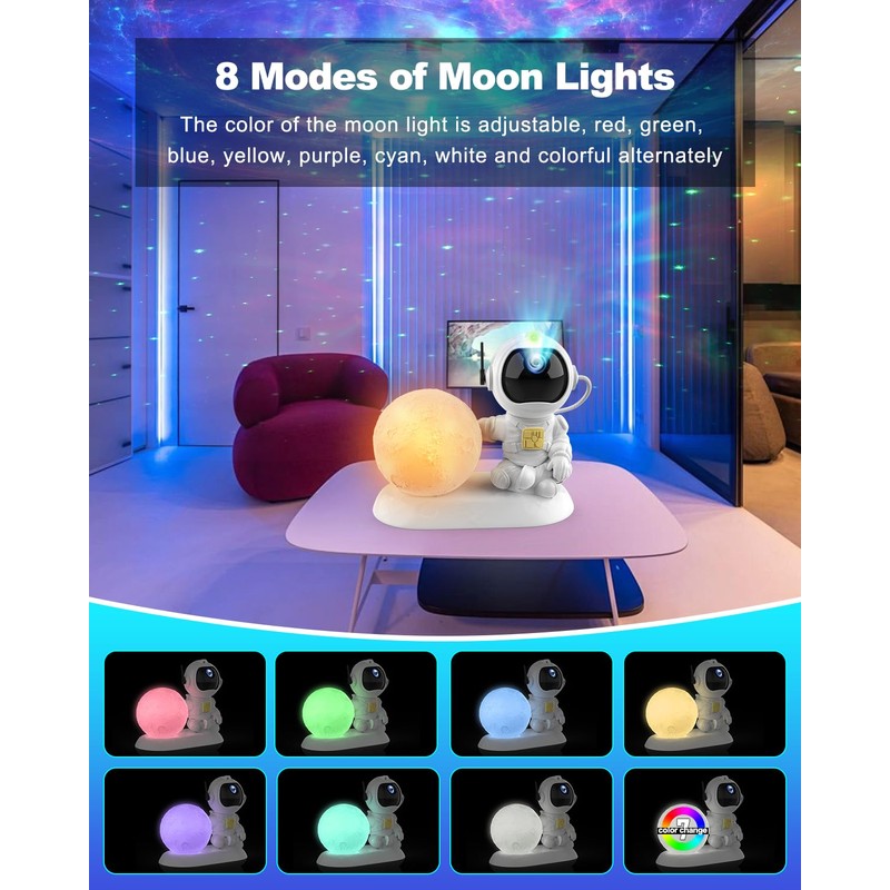 • Astronaut Galaxy ProjectorThe projector is designed in the shape of an astronaut. Its head is magnetically attached and can be rotated freely to adjust the projection angle of the nebula. Automatic shutdown after 8 hours without operation. You can also set a timer(1H/2H), it will turn off when the children sleep.