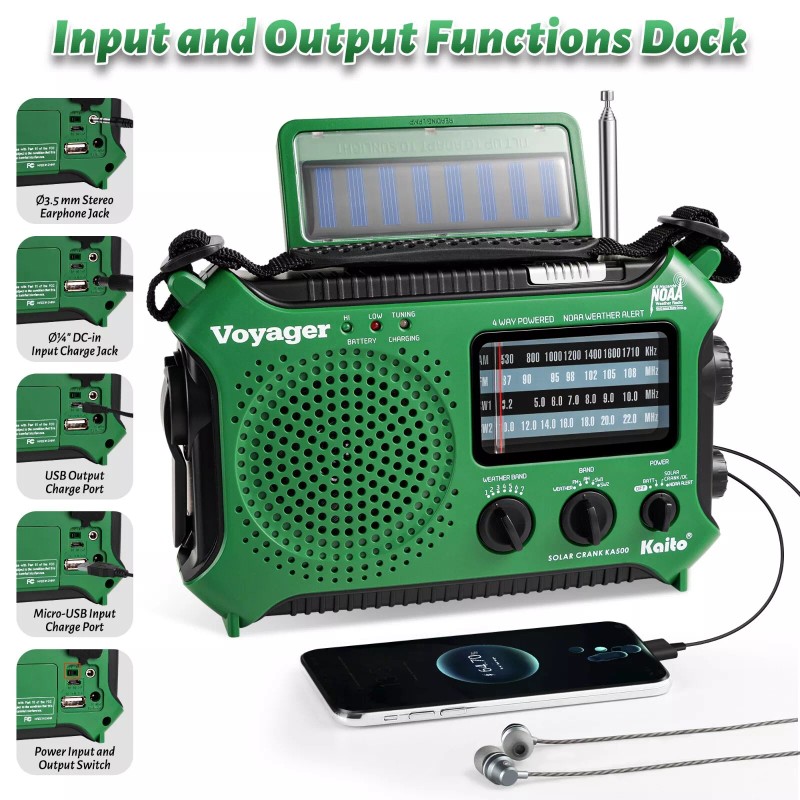 Kaito KA500 Weather AM FM Shortwave Solar Crank Emergency Radio with Flashlight