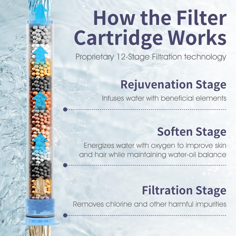 Multi-Stage Filtration: Removes chlorine, fluoride, heavy metals, sediment, and other impurities.