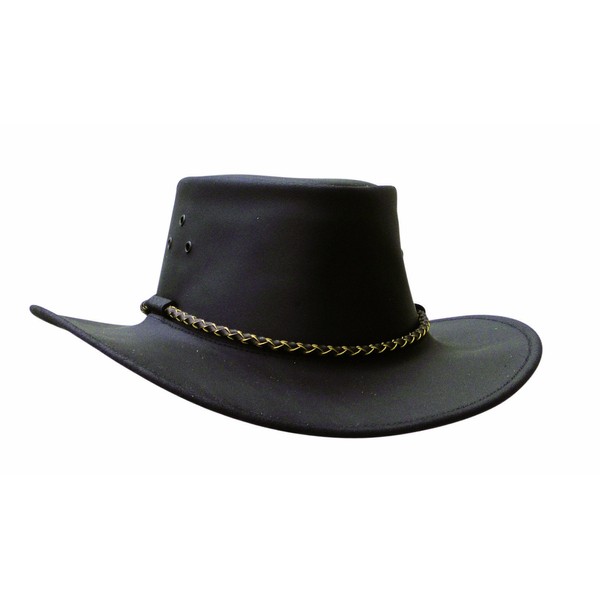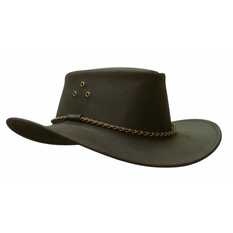 - Description|Sizing|Fabric Care| Built from buffalo hide the Echuca hat is real traditional Australian styling. With a slight oiling to keep it pliable the more you beat it the more you will like it as it takes on its own unique personality. We don't usually wear a chin strap on these hats but we have set up a place to put one if you want. Also comes with our round braided hat band triple eyelets for air flow and our own unique internal sweat band. |3 inch brim 3 1/2 inch crown| Size Guide: S-XXL Check out how to measure to get your perfect hat size click here | 100% Genuine Leather | CARING FOR YOUR LEATHER HAT |Brush off surface dirt using a soft brush or wipe with a damp cloth and allow to air dry.|Occasionally rub in a quality leather dressing which will keep the leather pliable. Ensure that the leather is not subjected to extreme heat.