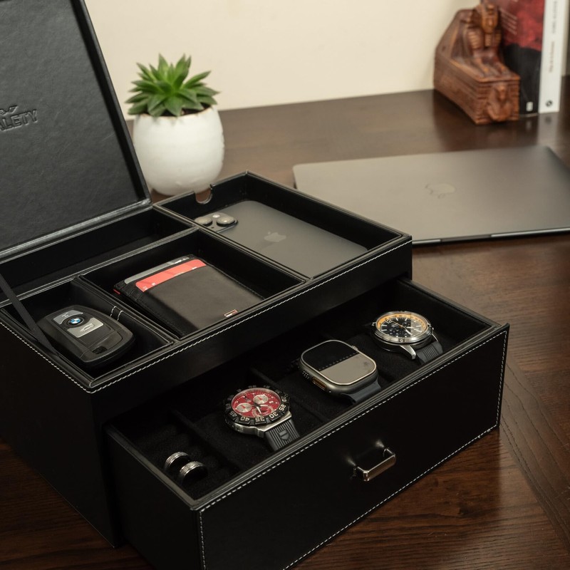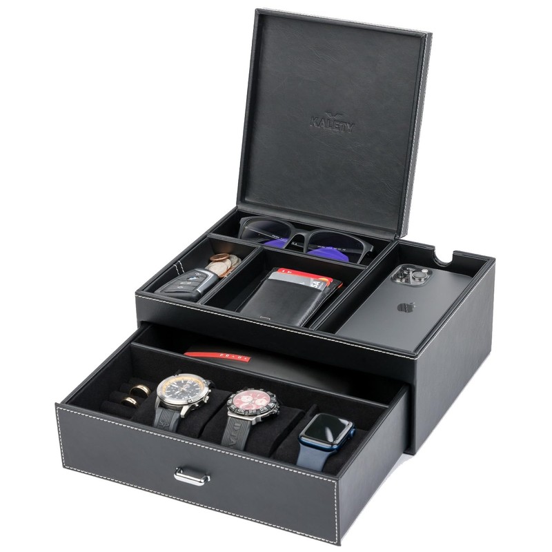 KALETY Mens Jewelry Box Organizer with Watch Holder - Mens Valet Tray Organizer, Mens Dresser Top Organizer, Leather Valet Tray for Men, Nightstand Organizer Tray, Ideal Mens Nightstand Organizer