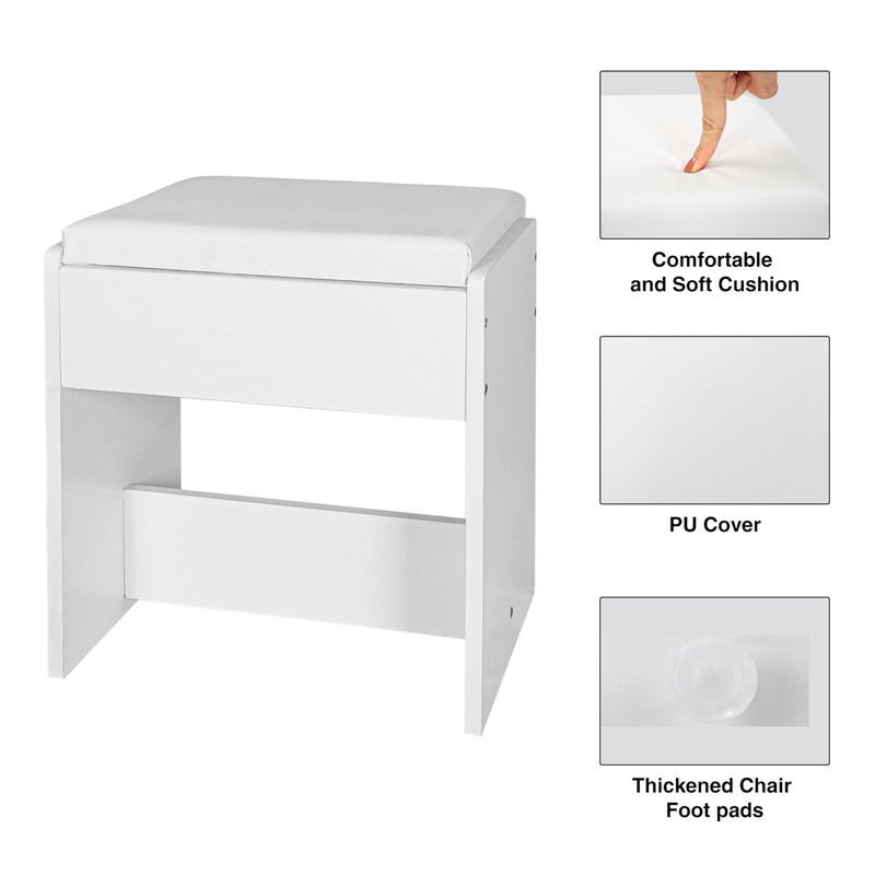 - đăVersatile and Practical DesignăIn addition to its chic appearance, this vanity is equipped with 2 USB ports and 2 AC outlets for your convenience. A dedicated hairdryer holder is conveniently located on the right side, allowing you to blow-dry your hair without needing to move. Additionally, it comes with a matching stool, eliminating the need to purchase one separately.