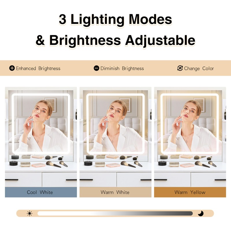 Featuring a sleek design, this vanity includes a high-quality mirror illuminated by customizable LED lights, allowing you to choose from 3 color modesâwarm, cool, and naturalâensuring you always look your best, day or night. The adjustable brightness settings let you create the perfect ambiance for any occasion, whether youâre getting ready for work, a night out, or simply pampering yourself at home.