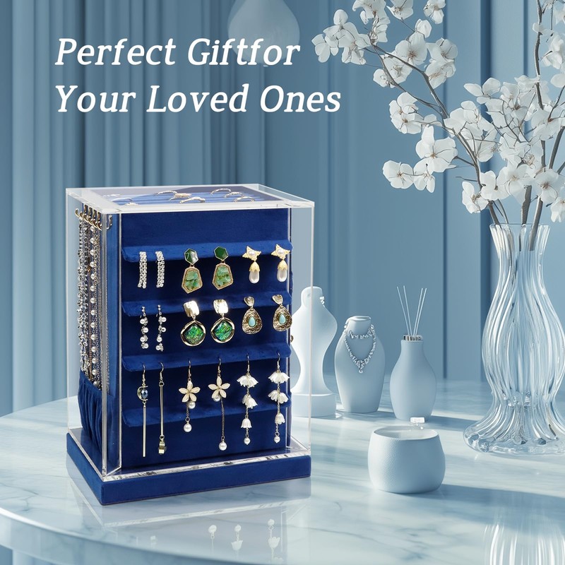 KAMIER Jewelry Box, 360° Rotating Jewelry Organizer with 5 Drawers,Large Jewelry Storage,Clear Window,Golden Handle,Vertical Jewelry Holder for Earrings Necklace,Gift for Women, Blue