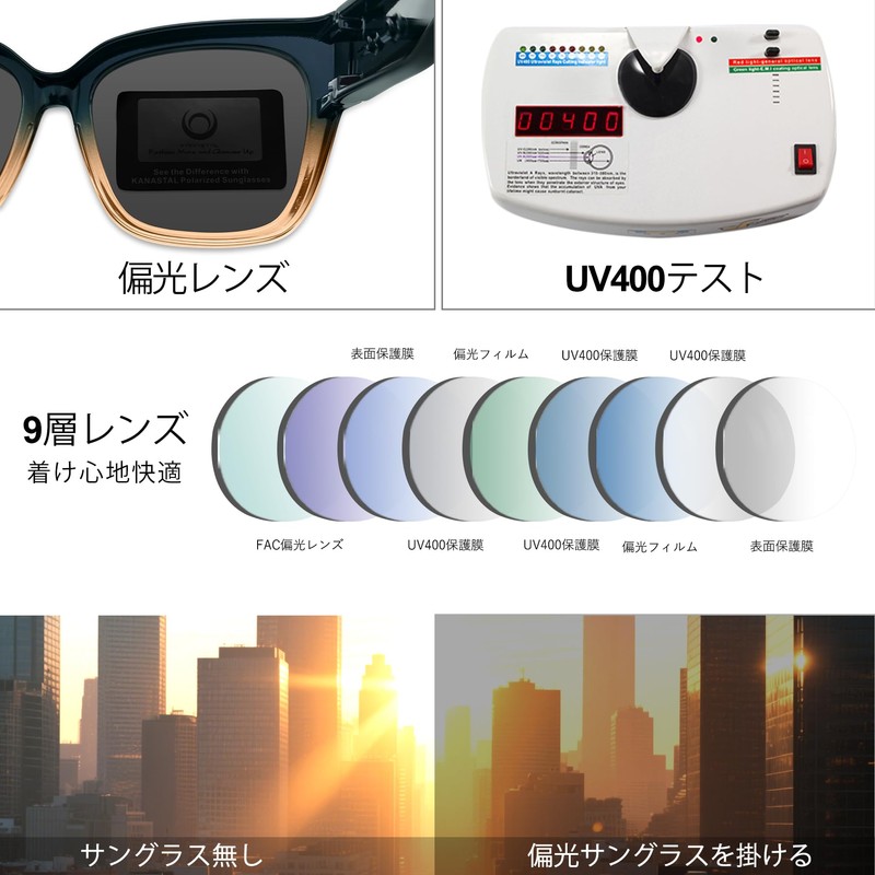 - 高機能TAC偏光レンズ:高性能TAC偏光レンズを採用しており、UV400相当の紫外線を99%以上カット。偏光機能が反射光・散乱光を効果的にフィルタリングし、ドライブ時のフロントガラ照り返しや釣り場の水面ギラつきを軽減。景色のコントラストを自然に保ち、視界のクリアさと色彩再現性を両立させます