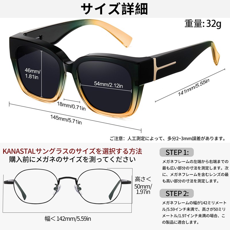 - 大きめ対応、眼鏡着用者の福音書:メガネの上からでも、裸眼でもサッと装着できる大ぶりなオーバーサングラス。特大TAC偏光レンズがあらゆる度付きメガネを完全カバー。近視、遠視、老視の方も快適に使用可能。二重メガネを掛けても、違和感がなく、逆に掛ける人がおしゃれなオーラがさしているようなかっこいいサングラスです